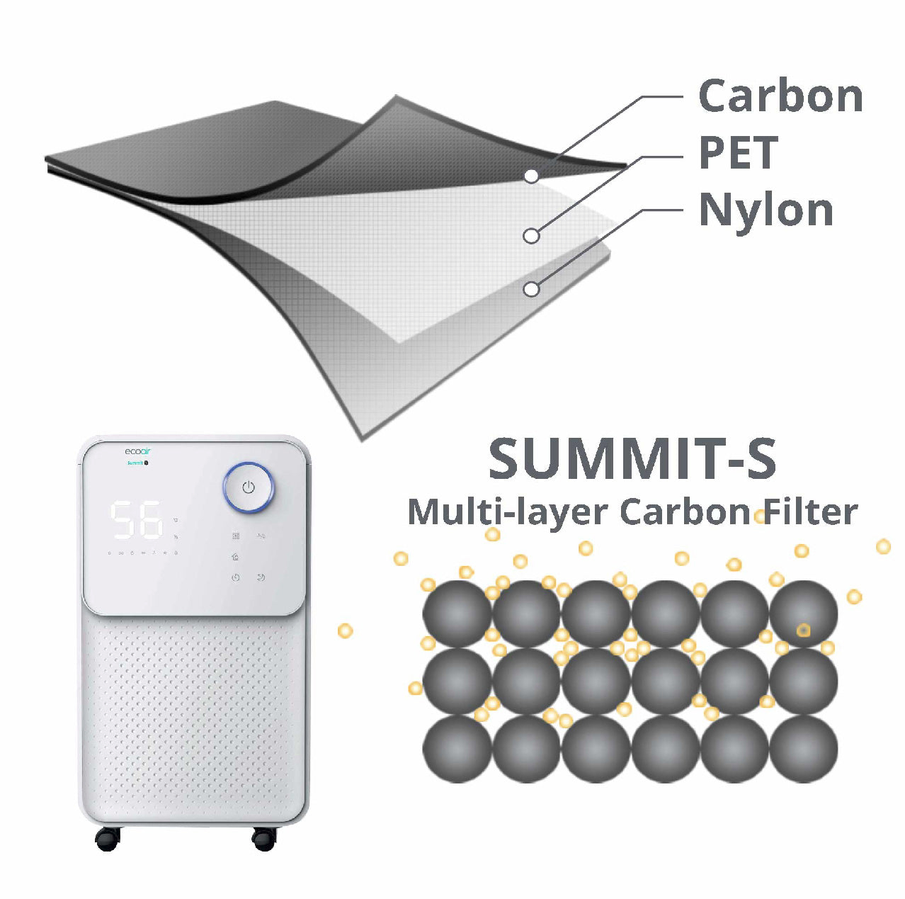 EcoAir Summit-S is een mooi ontworpen luchtontvochtiger met een energiezuinige werking. Hij geeft duidelijk de luchtvochtigheid aan op zijn grote display. Summit-S kan tot 12 liter water per dag verwijderen. Dankzij het 3-laags koolstoffilter, PET-filter (Polyethyleentereftalaat) en stoffilter, kan deze kleine ontvochtiger de lucht ook reinigen. De combinatie van ontvochtiger en luchtreiniger is ideaal voor het verkrijgen van een aangenaam binnenmilieu. Geen last meer van vocht en vervelende geuren.